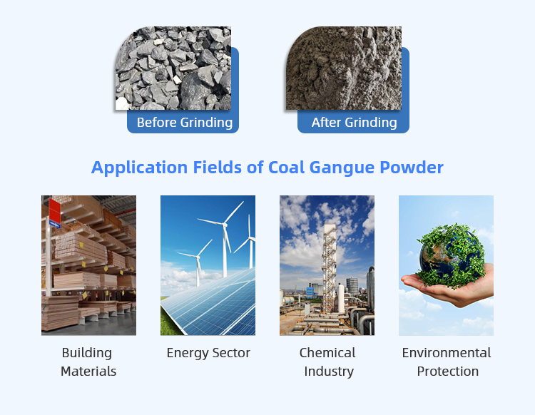 Gangue is uniformly, quantitatively, and continuously fed into the grinding chamber of the main unit via a variable-frequency belt feeder for grinding. The ground gangue powder is conveyed by the fan air flow to the powder separator for classification. Under the action of the analyzer, materials that do not meet the fineness requirements fall back into the grinding chamber for regrinding, while qualified powder is transported by the air flow through pipelines into the cyclone collector for separation and collection. The finished powder is discharged through the discharge device. The separated air flow enters the fan through the return air pipe at the upper end of the cyclone collector. Operating under negative pressure and airtight conditions, the production system is equipped with a pulse dust collector to prevent dust emission, fully complying with national environmental protection standards.