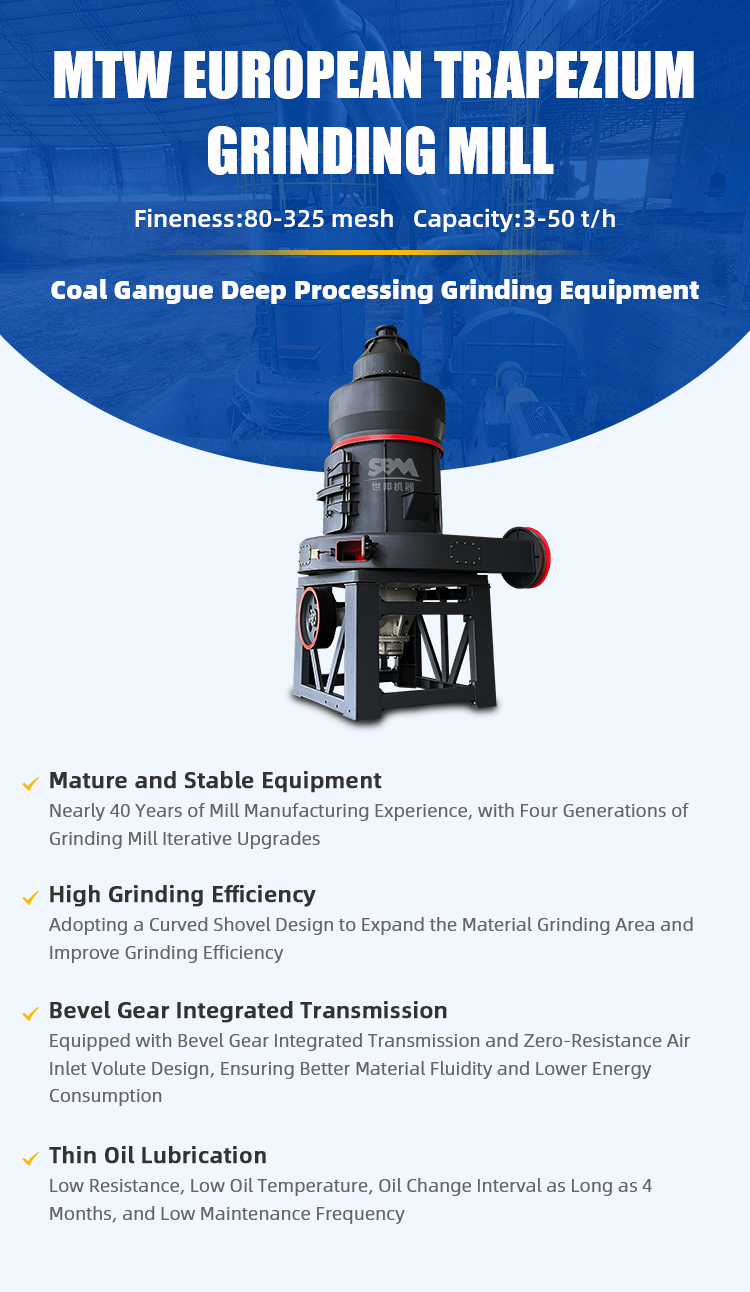 Targeting the characteristics of Inner Mongolia's gangue—high hardness, poor grindability, and significant carbon content fluctuation—SBM customized MTW European Trapezium Grinding Mill as the core equipment for the project. Adopting a unique roller structure and dynamic eddy current powder selection system, the equipment is equipped with high-quality wear-resistant rollers and an intelligent control system, enabling precise regulation of the finished product fineness at 50 mesh.