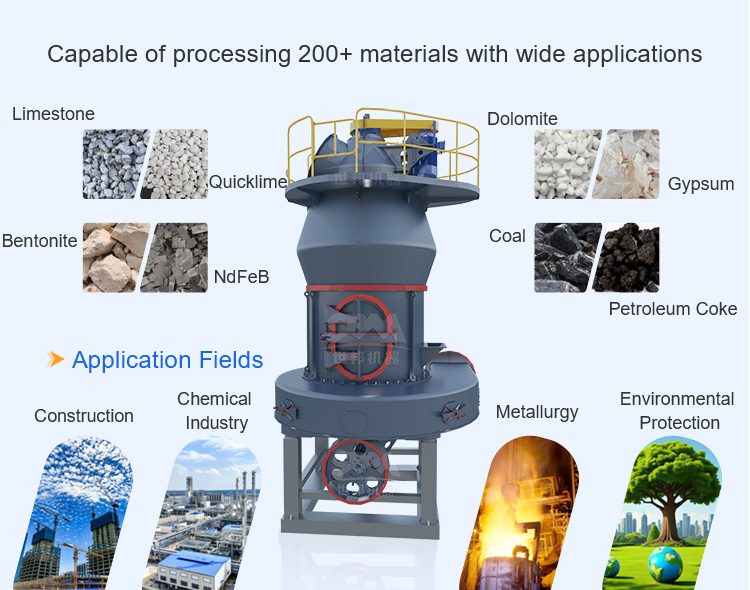 It specifically covers the grinding of limestone, calcite, dolomite, limestone for environmental desulfurization, magnetic rare earth materials, bentonite, barite, clean coal powder, petroleum coke powder, and other materials. It is especially suitable for grinding non-flammable and non-explosive materials with Mohs hardness below 7 and moisture content less than 6%.